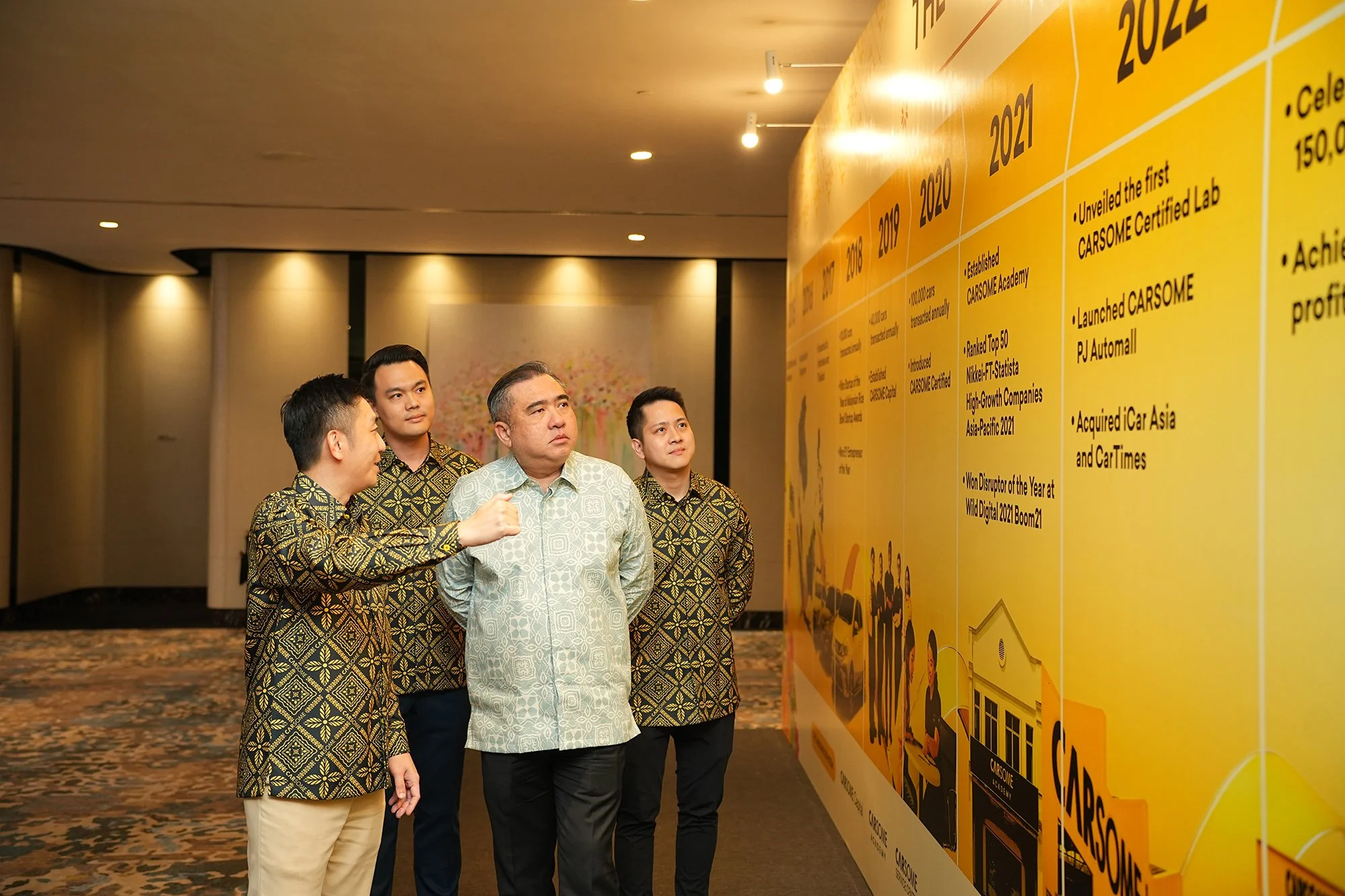 (From front, left) Eric Cheng, CARSOME Group Co-founder, Chairman and CEO, walking YB Anthony Loke Siew Fook, Minister of Transport, Malaysia through CARSOME’s 10-year milestone during the gala dinner, accompanied by (back, right) Teoh Jiun Ee, CARSOME Group Co-founder and CEO of CARSOME Academy; and (back,left) CARSOME Group’s Chief Business Officer, Aaron Kee.