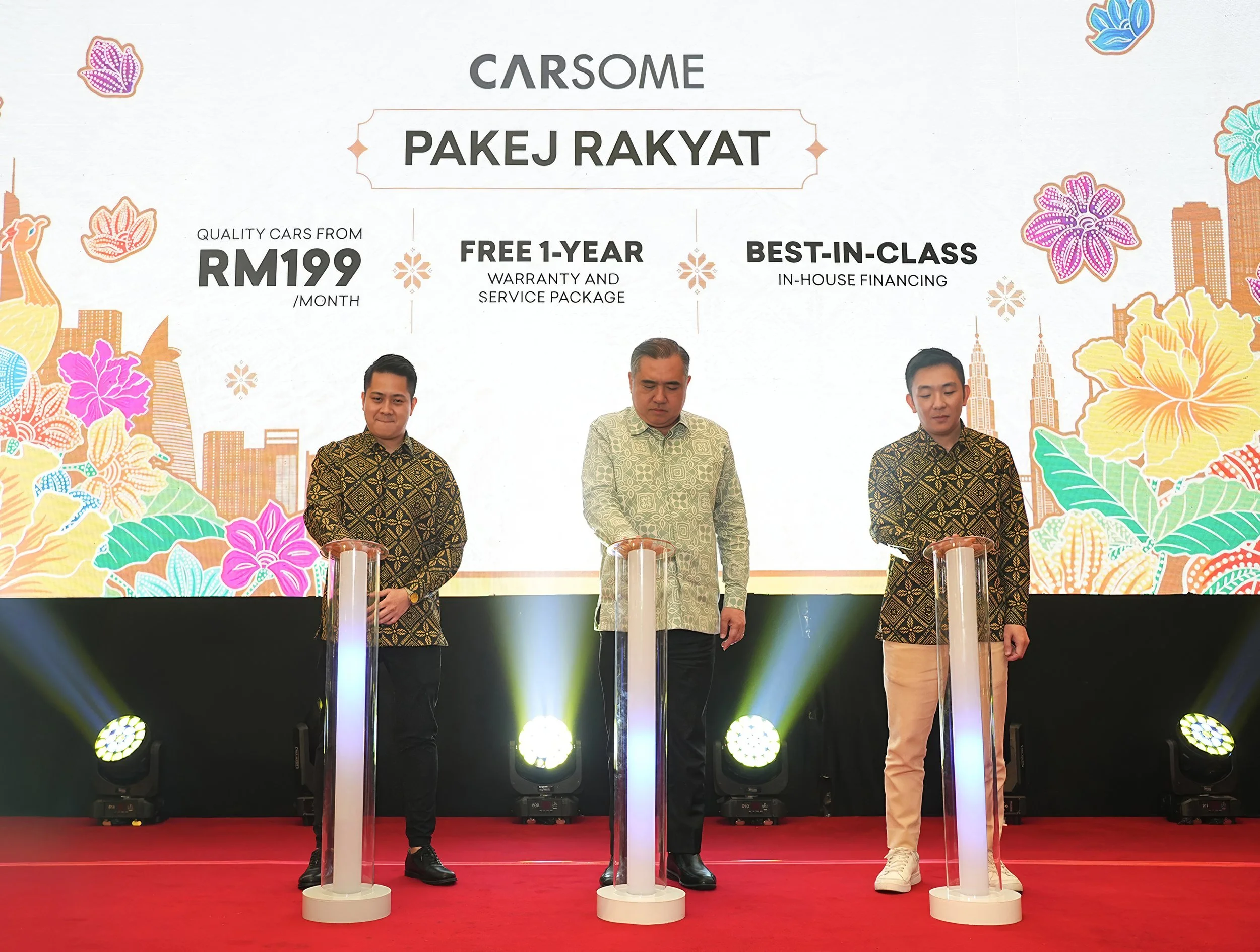 (From left) Teoh Jiun Ee, CARSOME Group Co-founder and CEO of CARSOME Academy; YB Anthony Loke Siew Fook, Minister of Transport, Malaysia; and Eric Cheng, CARSOME Group Co-founder, Chairman and CEO, officiating the launch of Pakej Rakyat at CARSOME’s 10th anniversary celebration.